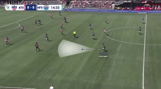 Bustos always operated on the right wing for Pacific, and you always knew that he loved to cut inside on his left foot. So in this clip, as soon as he cuts inside and has space to deliver the cross, that’s exactly when Diaz perceives the moment to burst into space and get ahead of his defender.