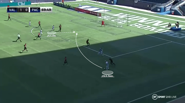But the wing wizard also recognizes Diaz’s own unique characteristics, particularly the Mexican’s height. He’s 5’10, and unlikely to win the header against the big burly 6’2 defender he’s up against. So Bustos plays the cross slightly lower, in front of the Valour defender and in between the gap that he sees before delivering. This gives Diaz every chance of winning the header, and smoothly caressing the ball into the back of the net.