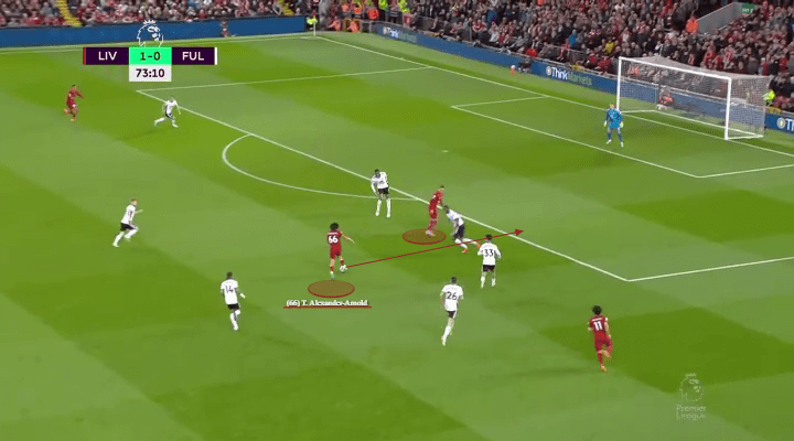 If you press Liverpool, they’ll always find a way around you (if not over you) through the immense speed of the likes mentioned above. So you have to sit back, wait and be patient. That means that players deeper on the field end up spending a lot of the time on the ball, completely unopposed and unchallenged. Put Trent Alexander-Arnold in a role where he’s now one of those unopposed players, and now he has more time and space to maneuver. He no longer has the touch-line acting as a barrier to his right, or wingers trying to press his every action.