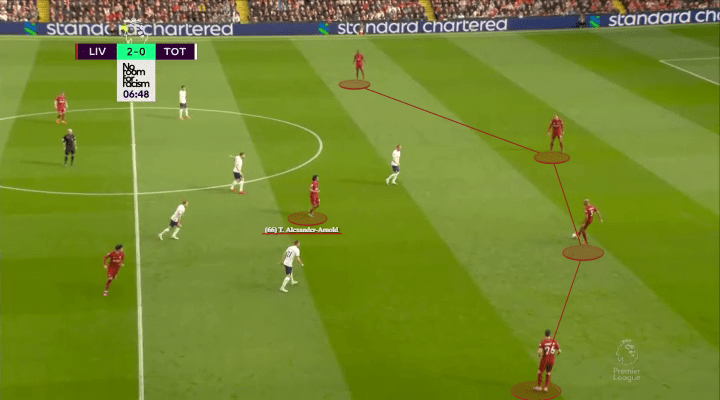 Within that 3+2 shape, he’s now becoming the central figurehead to progress the play up the pitch and dictate the tempo of the match. Other than Thiago, Liverpool don’t really have that type of ‘Tempo Setter’ or ‘Deep-Lying-Playmaker’ to fulfill the void in midfield. So this has been a smart way to not only get the best out of the 24-year-old’s immense quality on the ball, but to fulfill a specific need for the team.