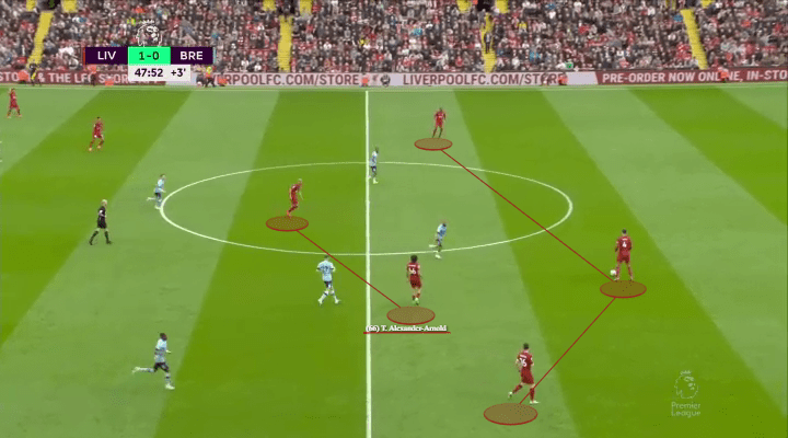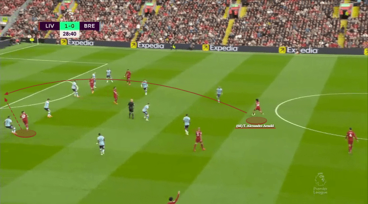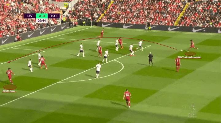 This then gives the opposition a dilemma. If you crowd around the full-back, knowing you can’t give him space and time, you’re leaving other players open to hurt you. But if you don’t pick him up properly, then he’s going to pick up great positions of his own to use his long-passing expertise to perfection, and set the likes of Mohamed Salah and Darwin Núñez free.