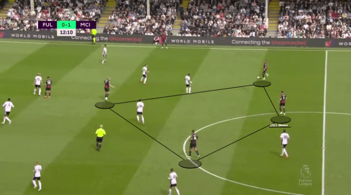 Manchester City adopt this shape to intentionally compact opposition defenses, thus opening more space into the wings. Secondary to that, they overload central areas themselves by having more direct lines of passing networks for short and quick connections through the thirds.