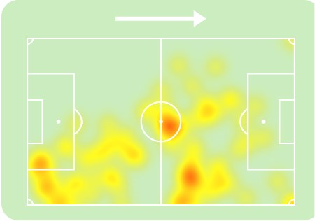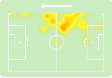 His single-match heatmaps no longer spike highest in the right-half-spaces, but now accumulate the most red spots in central avenues.