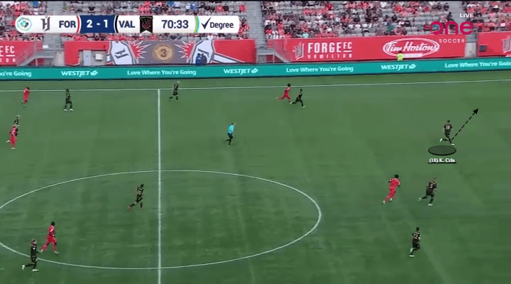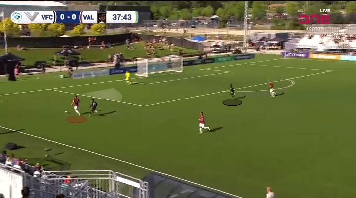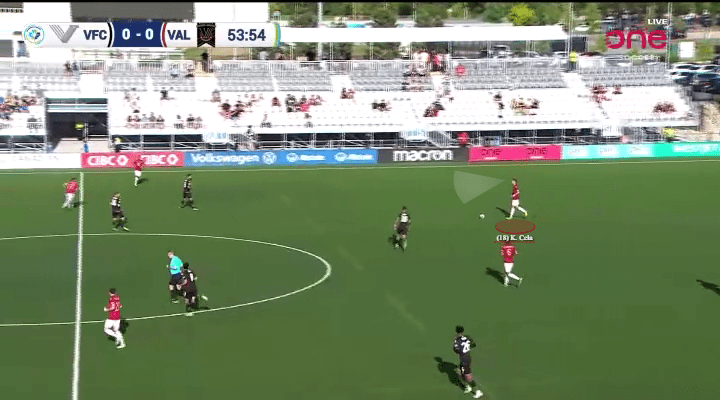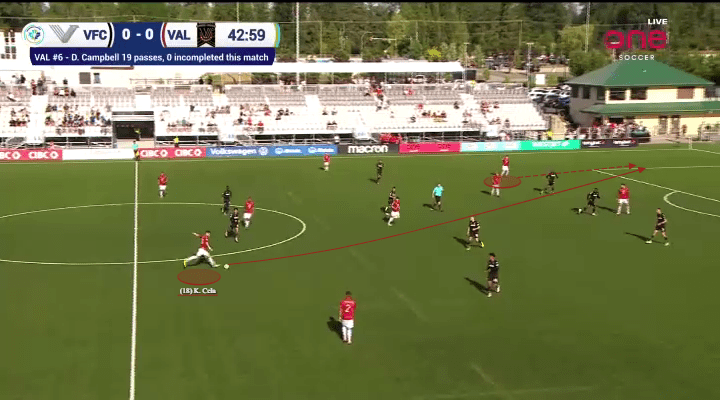 The 6’3 centre-back is not only able to correctly assess those moments to play passes down the line into the half-spaces, but he possesses the ability to execute on those desires with the right weight of pass. Niyongabire has proven to be quite the progressive runner, and having someone to find him in the channels has been a quick method for Valour to easily advance the play.