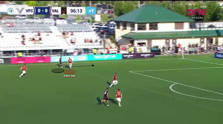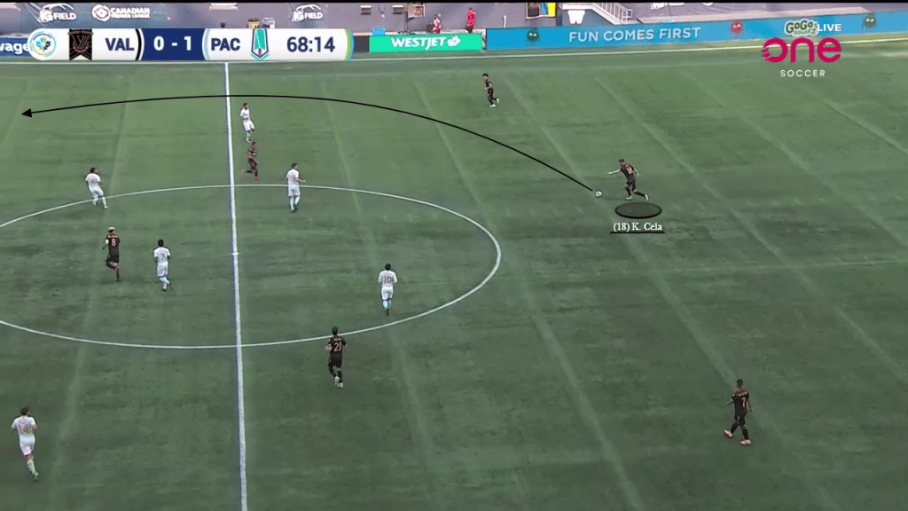 Cela also uses that scanning prowess to assess the right options when he finds himself under pressure. He rarely seems to panic on the ball, and often makes sound judgement calls as a result of his perceptions of BOTS. In the below example, Cela sees the danger of Vancouver’s striker, and opts not to play the back pass to his goalkeeper. Instead, he turns the man breathing down his neck inside out.