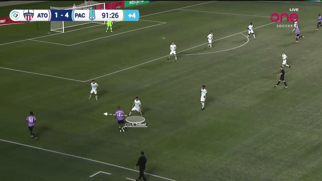 Instead of his pace reverberating off the grass, Sellouf prepares to slowly progress toward a defender, enticing them to make the first move. You might see moments of speed pop more on the break, where Sellouf’s skill shines in finding moments to quickly progress the play up the pitch.