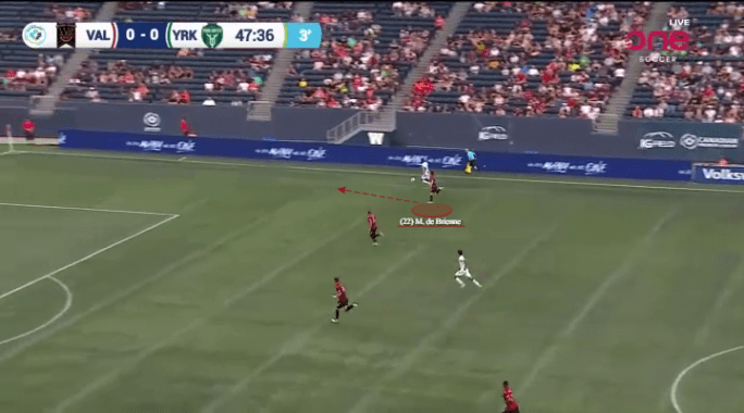 Since PJ Williams will often prefer to receive the ball close to the touchline, De Brienne’s made a particular habit of making underlapping runs through the left-half-spaces, before delivering crosses into the box.