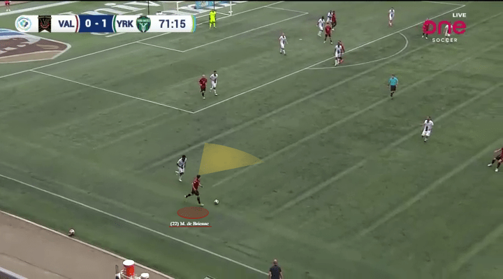 While evidently still learning his trade and figuring out where to be, De Brienne has never looked out of touch with his new position. He often narrows his positioning as a starting place to compact the field and cut out central options closer to goal, before quickly reacting as the ball shifts over to a player in his zone.