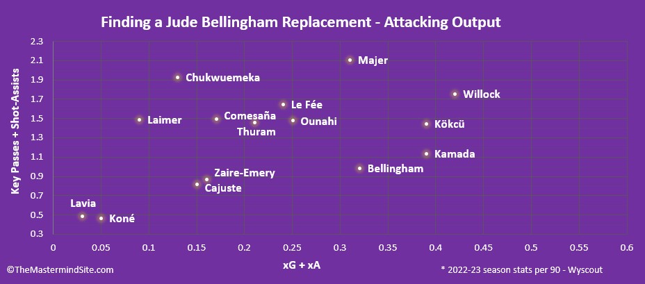 In finding a suitable replacement, this is however the most difficult category to replace. It’s rare to find a player that combines all the wonderful assets of Bellingham, and then also contributes so prevalently in front of goal. Joe Willock stands out once more for his late arriving runs and precision passing, but remains a difficult asset to attain. Beyond Willock, from a pure chance creation and goal-scoring perspective, it’s 22-year-old Orkun Kökcü that looks the most impressive.
