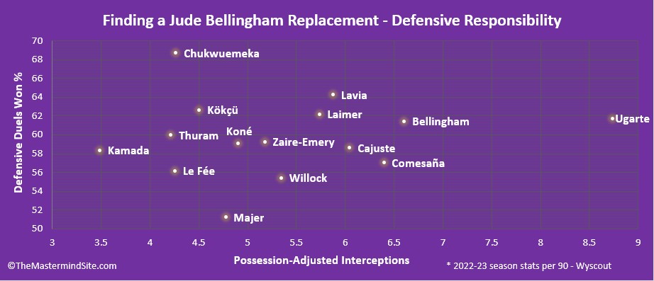 Embed from Getty ImagesThe 19-year-old won 62% of his defensive duels in 2022-23, while ranking in the top 7% of midfielders on ‘blocks’ (combined blocked passes and shots). Always loving a good tackle, Bellingham even won more possession-adjusted sliding tackles than any of the 20 players we’ve analyzed as potential replacements.