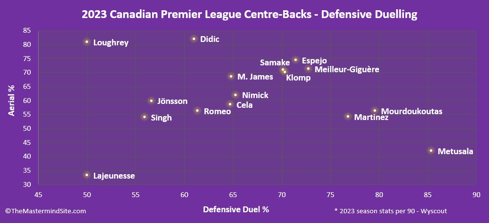 On the rare occasion that Nimick goes to ground rather than using brute force, the Newfoundland defender times his challenges well and slides in safely. In fact, he’s been dribbled past just 0.3 times per 90 this season.