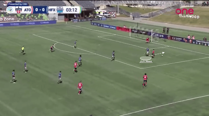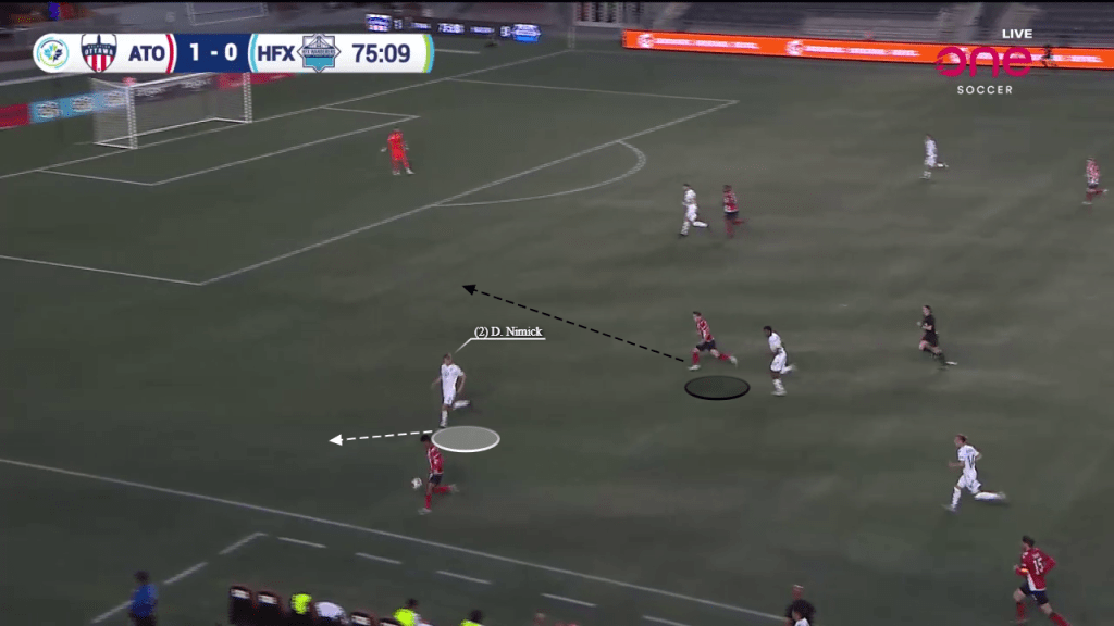 Any time a defender makes this move to cover for their full-back in a back-four shape, spaces can open between the centre-backs. So when making this shift, Nimick must remember to close the gap quickly. A leisurely approach will lead to clever attackers exploiting that space, just as Atletico Ottawa found here in their 2-0 win against the Wanderers.