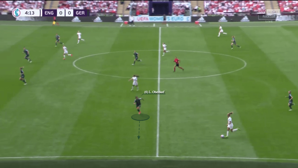 In spite of not being the fastest player, Oberdorf is also quite successful in covering ground. She’ll nicely cover the wide areas to stop passes in behind her full-back, but she’s also completely capable of holding down the midfield line all on her own. This is integral for any ‘Midfield Destroyer’, and certainly encouraging for Germany given that they’ll likely operate with two attack-minded midfielders ahead of her in their 4-3-3.