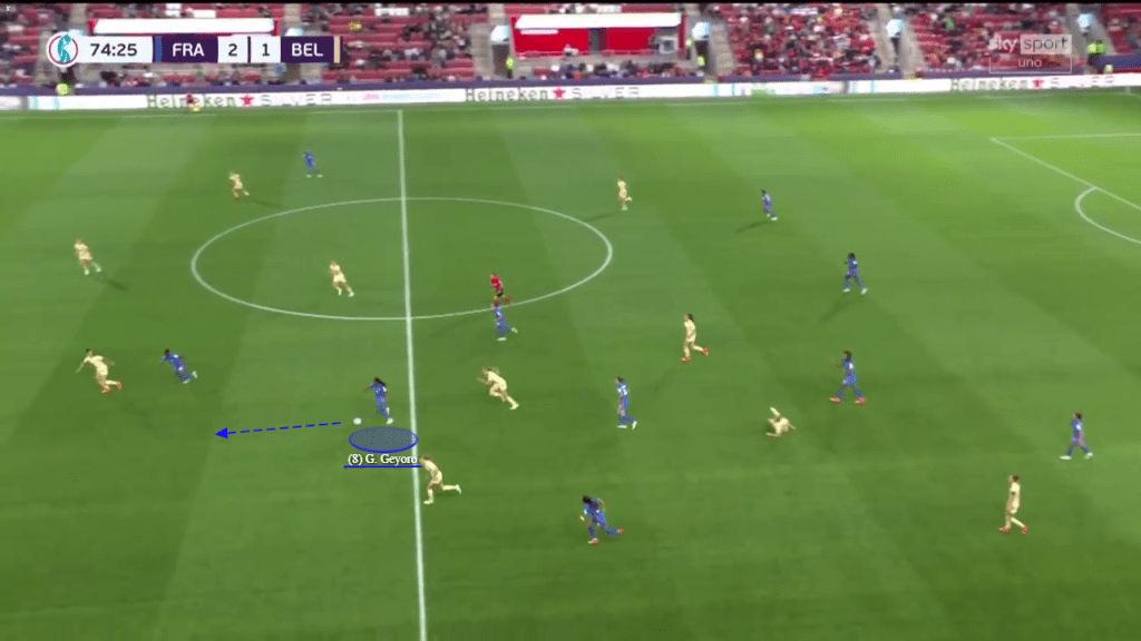 When in full flow, Geyoro is extremely difficult to match for pace. When you combine that with precision close control and an awareness of when to push the ball ahead of herself with bigger touches (space ahead) and when to keep it tighter with little touches (under pressure), Geyoro is difficult to dispossess.