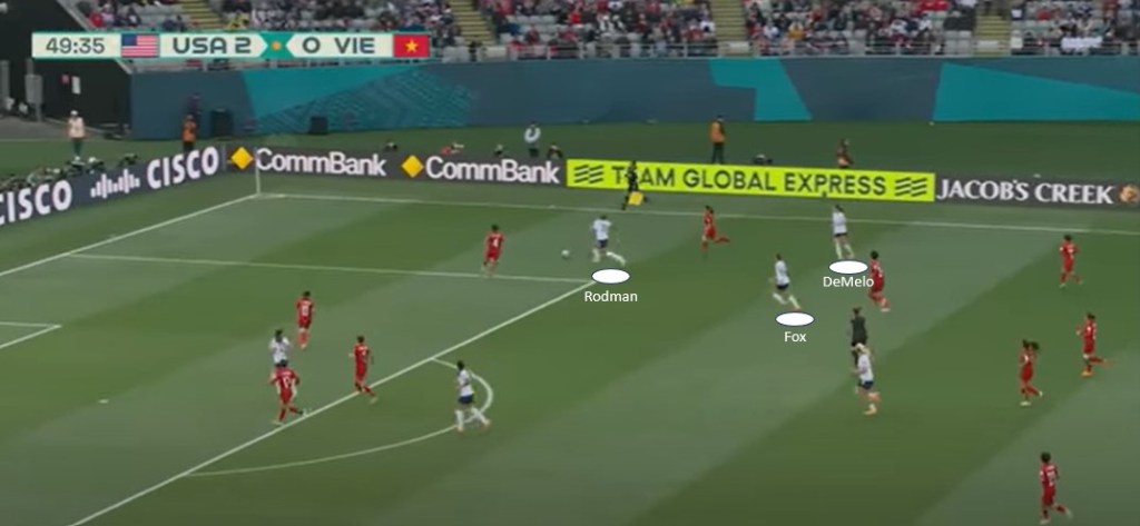 One of these rotations presented that beautiful chance for Lindsey Horan at the start of the second half, where DeMelo received wide in an overload with Rodman, as Fox surged through the half-space.