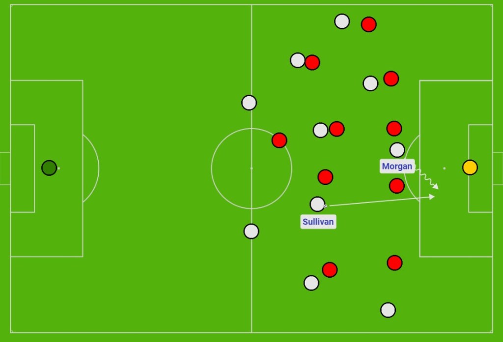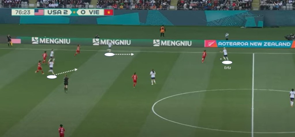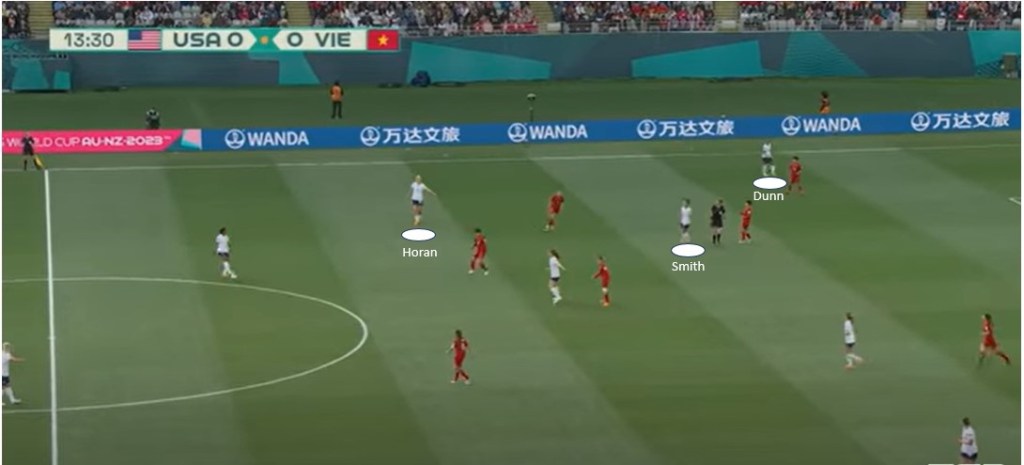 Not exactly a positional rotation, but one that meant Sophia Smith could then receive in central channels, closer to Alex Morgan. This is again how USA uncarved Vietnam so nicely through the centre of the pitch, with Horan dropping wide to play that progressive pass, and Morgan nicely playing the foil for Sophia Smith.