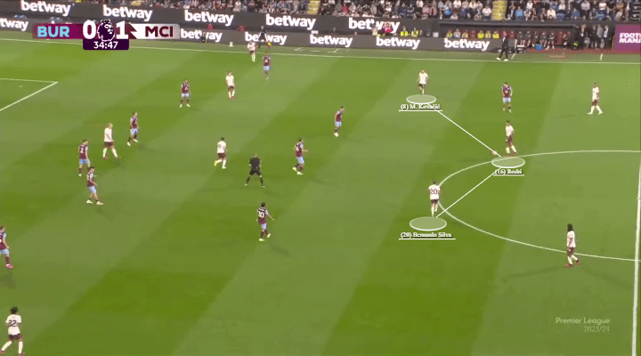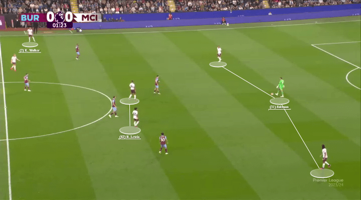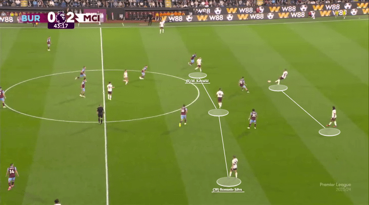 And now, it didn’t involve an ‘Inverted Fullback’. Rico Lewis showed his versatility by galloping up the left wing instead, allowing Julián Álvarez to continue playing more through the middle. Walker tended to do the same down the right, allowing Foden more of a free role coming inside from the right. Kovačić meanwhile hung out closer to Rodri and Bernardo Silva, as Ederson formed the base of the back-three in possession. If you’re Burnley now, who do you mark?