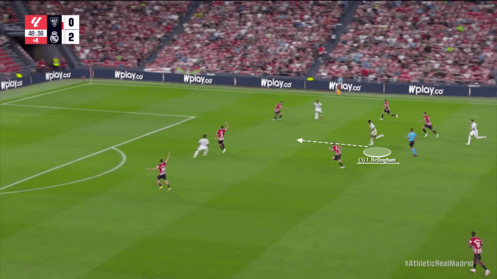 Check out this moment in the match, where Vinicius immediately becomes dejected after losing the ball. Don’t worry Vinicius! Bellingham’s on the case! Those long legs tend to come in handy, and allow the Brit to time his tackles to perfection.