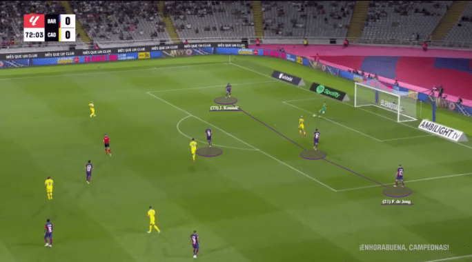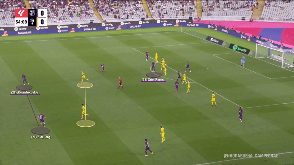 Operating in a front-two, Cádiz could then go toe-to-toe with the Barca men at the back, where a massive separation occurred between them and the next line of defense.