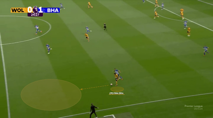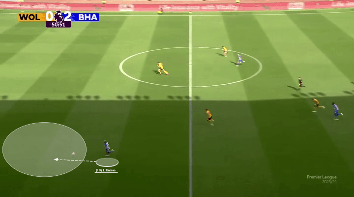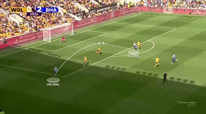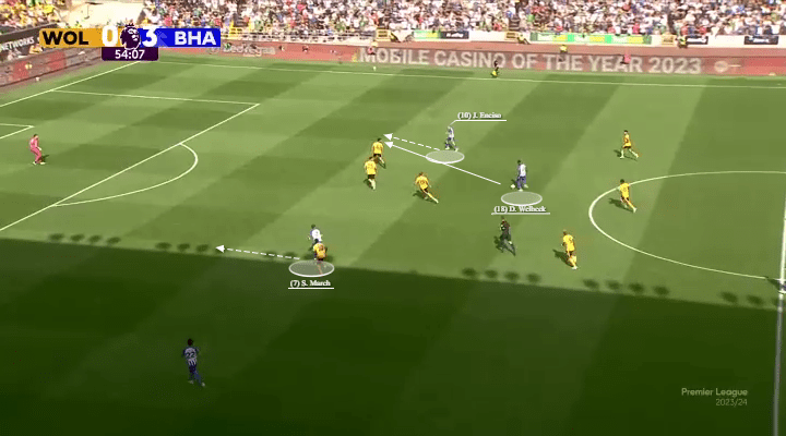 Similarly, on the second of Enciso’s incisive assists, Danny Welbeck takes advantage of Mario Lemina’s advanced position to drive forward through the centre and hang onto the ball a little while longer, thus pushing the defensive line back. But he does not just dribble in a straight line, straight at the defense. Instead, he dribbles toward the space available.