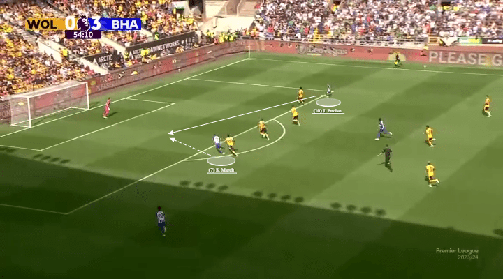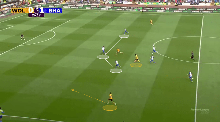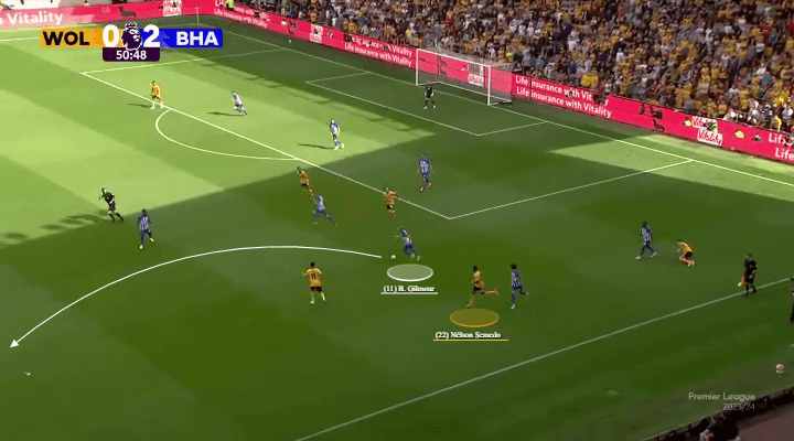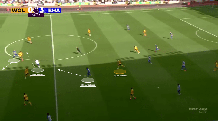 Embed from Getty ImagesNow in spite of their brilliance in attacking transitions, Brighton still have a few things to sort out going the other way. Their involvement of fullbacks either inverted or high up the pitch means that their wide areas will be targeted in transition. A 2+3 naturally means that teams will be looking to hit the wide areas in transition. This is where both Wolves and Luton could have hurt the Seagulls.