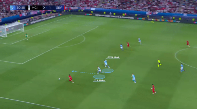 So this player type is simply a player that holds a more reserved, centralized role in-possession and then becomes a full-back out of possession. The roles of Kyle Walker, Nathan Aké and even Andy Robertson at the end of 2022-23 are examples of that more common type of ‘Inverted Fullback’ in our evaluation system, as they hold that reserved role centrally in the team’s build.