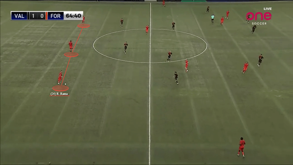 Embed from Getty ImagesThe Canadian Premier League equivalent is one of my favourite players, Rezart Rama. He’s built like a centre-back, but so outstanding with his pace, power, and ball progression, that he’s made for the ideal player to have in that back-three build for Forge, which then makes him a right-back out of possession.