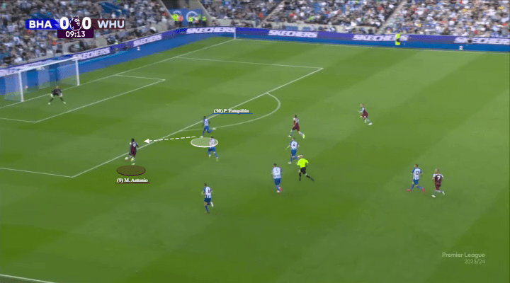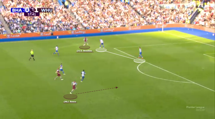 Jarrod Bowen‘s goal for #2 hits a similar note. The Hammers immediately hit Said Benrahma again in behind James Milner’s position, causing Webster and Dunk to compact together in stopping the Algerian. In doing so, they left a massive gap over on the other side, as Estupiñán recovered from his high attacking position. So even as Benrahma slowed the transition to wait for support from the likes of Jarrod Bowen, it didn’t matter.