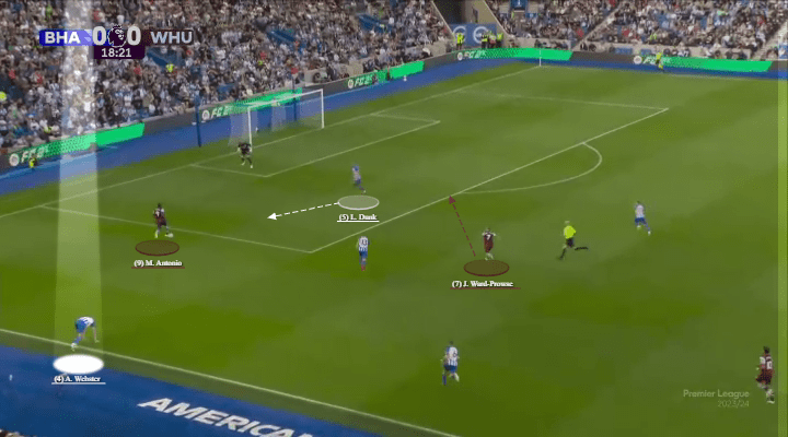 Webster naturally had to come across, and couldn’t handle the physicality of Antonio. With Webster now out of the picture, Dunk became the last man. Who was there to exploit the space left by Dunk? James Ward-Prowse.