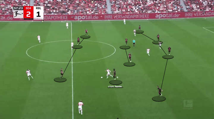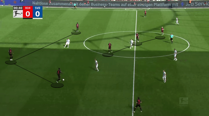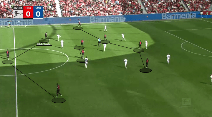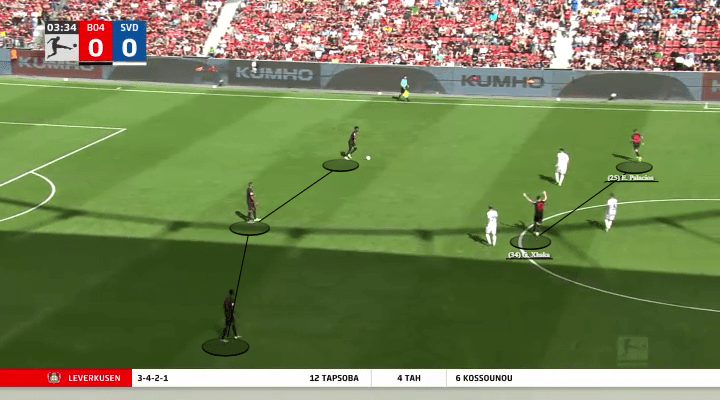 Embed from Getty ImagesBayer Leverkusen have been difficult to break-down on the defensive end, conceding 3 goals in their 3 matches thus far. At the front end of the pitch, they’ll press in a 5-2-3. The near-side central midfielder and wing-back will then remain ready to step, as their far-sided equivalents sit more reserved. Like most teams, they don’t exhibit all that much energy or vigour in their “press”, preferring to save the legs for the lung-bursting runs going the other way.