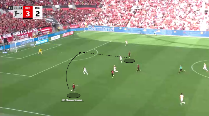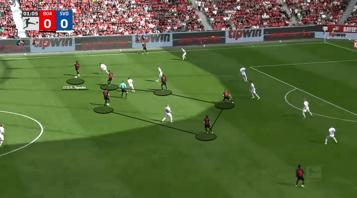 This extends all the way to their build-up, where similar concepts apply. Tapsoba and Xhaka are the men most frequently on the ball to aid the left-side dominance, where players will often bounce the ball between each other until they (often Xhaka) can find the perfect moment for a progressive pass between the lines.