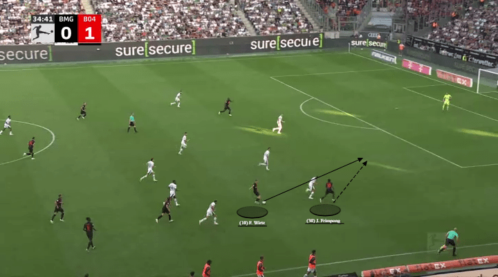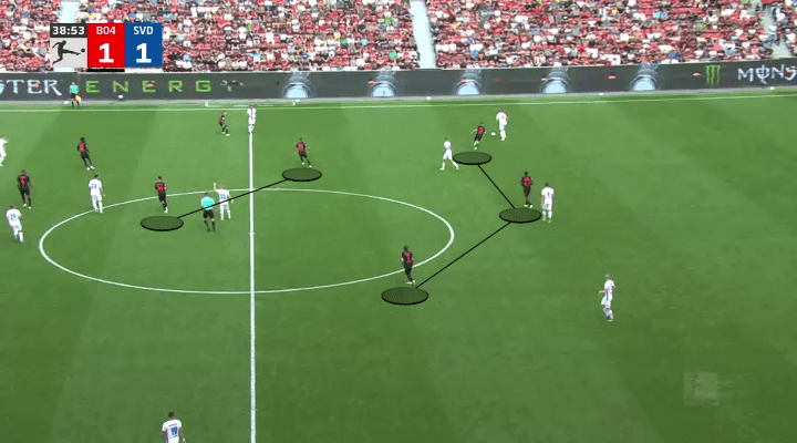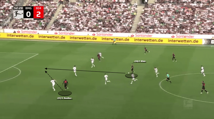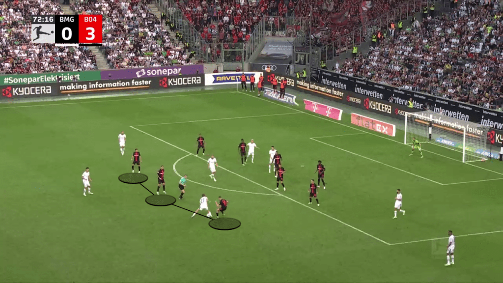 The 20-year old can also compound matters by coming toward the ball himself, making for something of a 3+3 as the midfield line can then rotate in and out of the spaces available. The below image presents a fun moment where the three of them formed a diagonal train. The opposition know that neither Palacios or Wirtz can receive the ball within their positioning, which is blocked by the passing lane into Xhaka, and multiple defenders in their way.