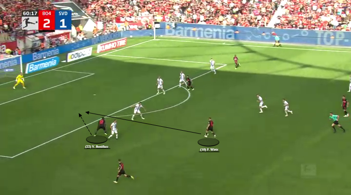 But don’t be surprised to see the young flying Dutchman only grow in goal-scoring prominence this season. Especially within the way he can sprint into space. These are the key passes that Leverkusen are often looking to create time and time again. Frimpong will look for the gaps high and wide in the right half-spaces, as Boniface floats between the right and the left, often finding that balance on the left.