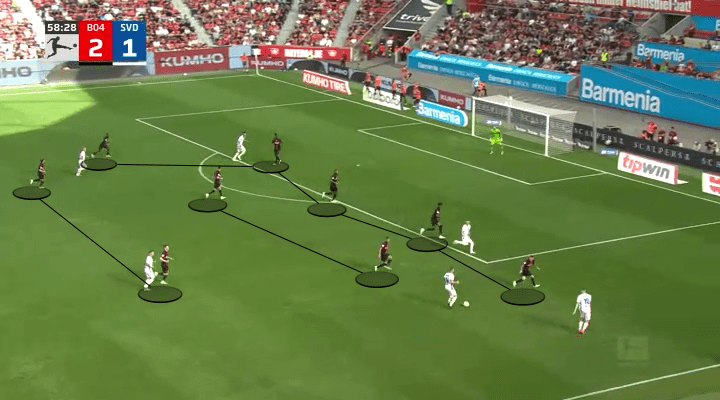 But from open play and longer spells within their defensive phase, I would struggle to see Leverkusen conceding too many goals this season. The typical shape is 5-2-2-1 in their lowest block, which is incredibly difficult to break down.