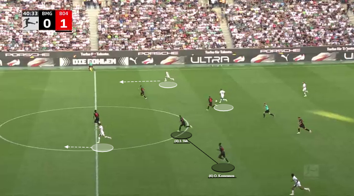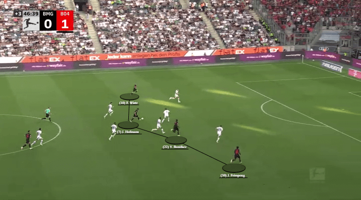 Embed from Getty ImagesSo instead of positional rotation, one of the key factors is the maintenance of width from the wing-backs. Hofmann and Wirtz will push inside, meaning that Grimaldo and Frimpong are the only men sitting outside of the spine. You can then create close connections between players to triangulate and shift the ball quickly around the defense, before finding that killer moment to play either a forward pass to split the defense, or a nice switch of play to a wing-back.