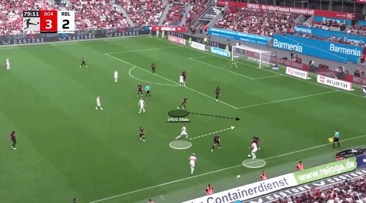 That false sense of security is exactly what they want you to think before they arrive at the open space at the exact right moment. We all know how Xhaka loved to float out to the left-half-spaces to receive for Arsenal, sometimes taking up the positioning of what would historically be associated with a left-back. He’s well familiar with orchestrating build-up and using his voice to dictate the play and this is a tremendous asset for a side that is now becoming one of the best possession-heavy teams in the league.
