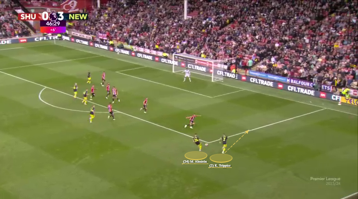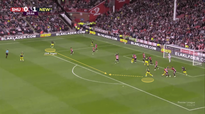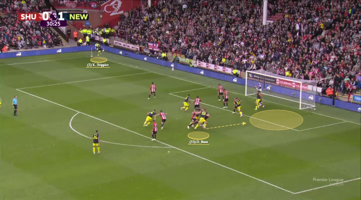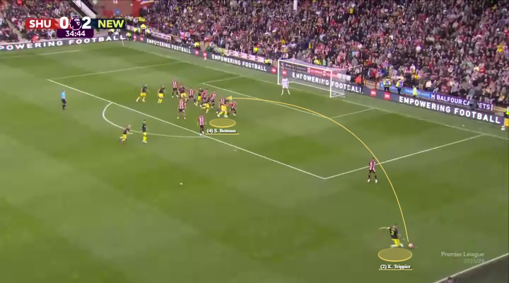 On his second assist, Trippier again gave Foderingham no chance. This time he knew the keeper would have room to come and claim if he didn’t swing the ball closer to the original line of height from the Sheffield defense. The delivery fell right onto the noggin of Sven Botman, who produced a sensational header into the back of the net.