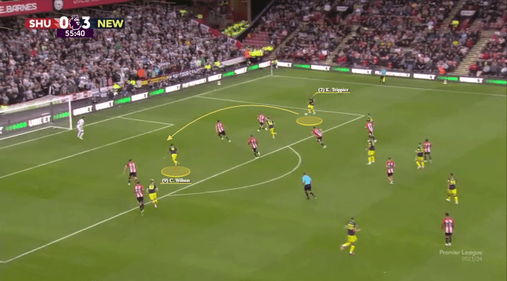 From these positions, Trippier can produce dangerous crosses in space, after Newcastle have won the moment with a wide overload. This is how Trippier created his third assist of the day, patiently waiting on the right-hand-side to deliver the ball on a one-touch and putting it on a plate for Callum Wilson.