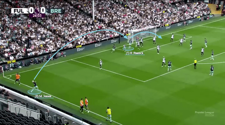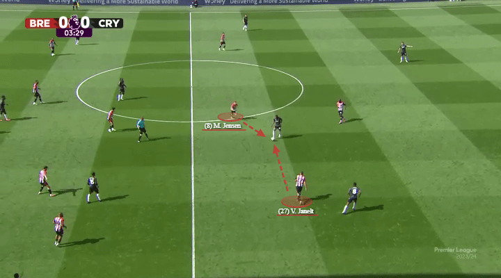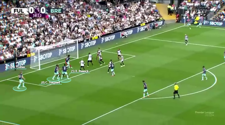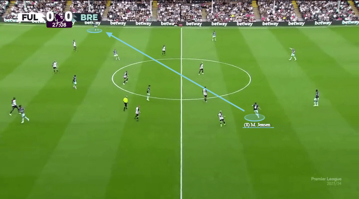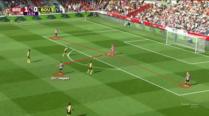 A 3+3 early buildup, utilizing Flekken as the third centre back and keeping the full-backs wide with Nørgaard as the pivot is their most common set-up. Jensen can drop in alongside Nørgaard, to create a further overload. But an important distinction for Brentord is that they are not afraid to go long if the opposition’s press is too much. It might not be option number one, but finding Wissa to hold-up the play and initiate a direct attack is not too bad an alternative.