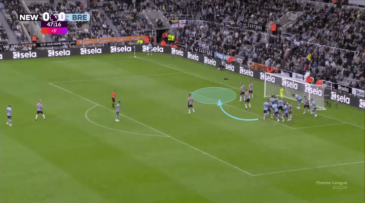 Now these are strong foundations, but Jensen is no James Ward-Prowse. Thomas Frank has built this set-play success from elaborate set-ups to attack the box and create space for his team’s ‘big hitters’ like Ethan Pinnock and Ben Mee. One of many examples of Frank’s ingenious is encouraging his players to cause confusion inside the box. They will often start hovered around one post, and immediately rush backwards to the other.