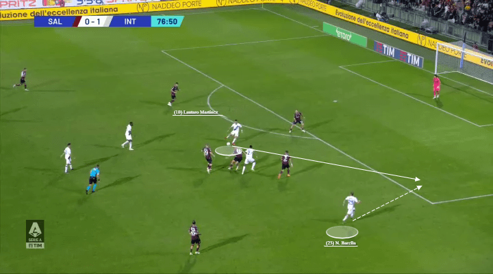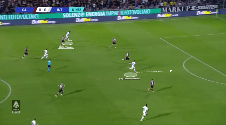 But like any good striking partnership, Marcus Thuram’s running power out wide can also benefit Martinez as he hangs high and central up front instead. On his first of the night, check out how Martinez perfectly positioned himself in between two defenders, maximizing his chance of scoring from a centralized position closer to goal.
