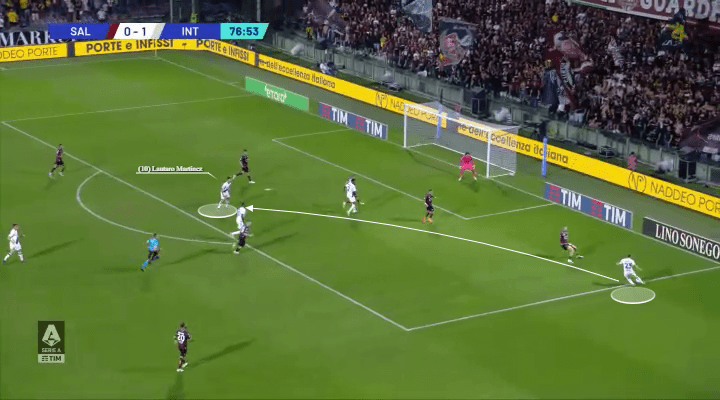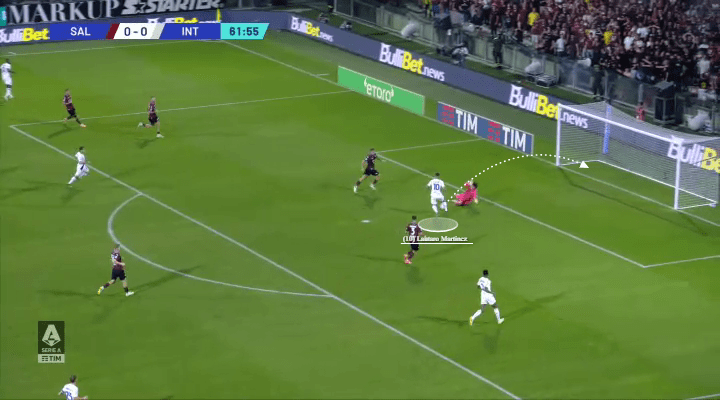 Expert movement is not only about arriving at the perfect moment with pace and power, like Watkins’ first goal against Brighton. Sometimes it’s about subtle adjustments of the feet, where you actually need to move further away from goal to make the magic happen. This is Martinez’s trademark, and what allowed him to score an incredible four-goal haul against Salernitana at the weekend.