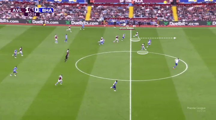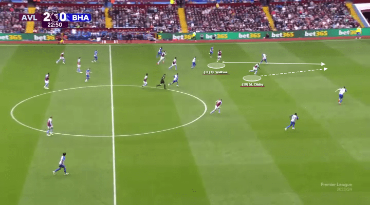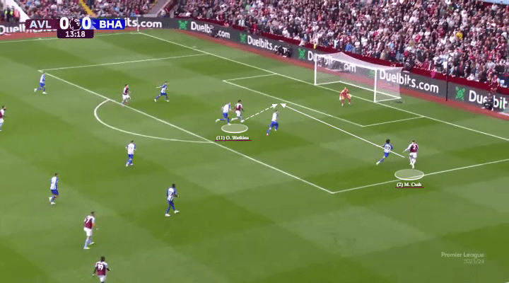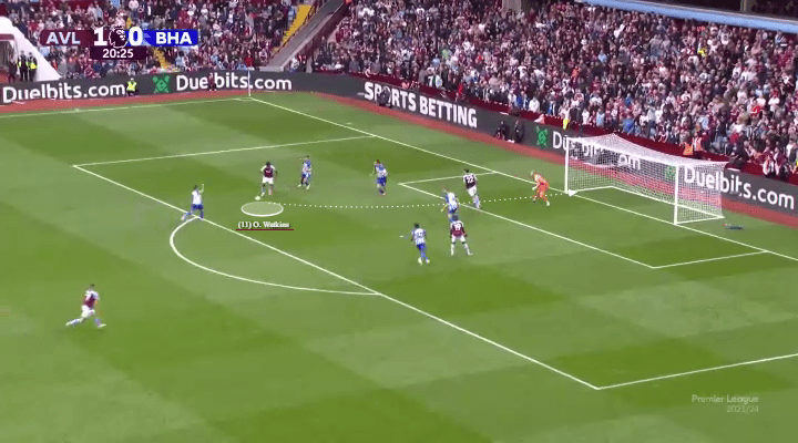 But he also utilized his own pace and power in transition to generate chances of his own. On his second of the day, Diaby fed the British powerhouse instead, as Watkins sought space in that exact weakness channel of Brighton & Hove Albion.