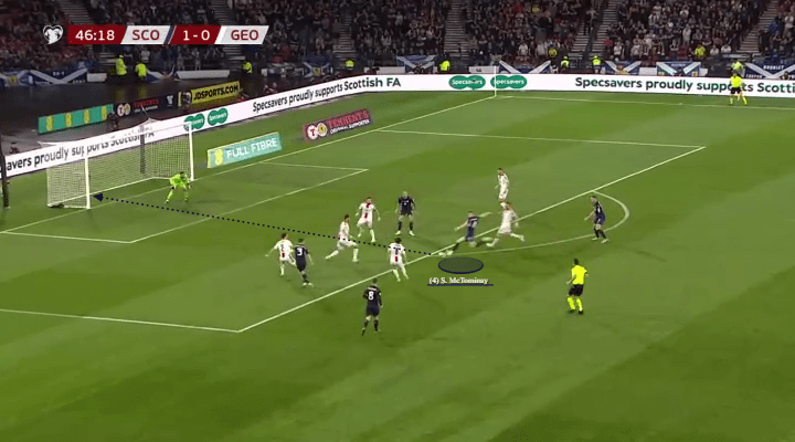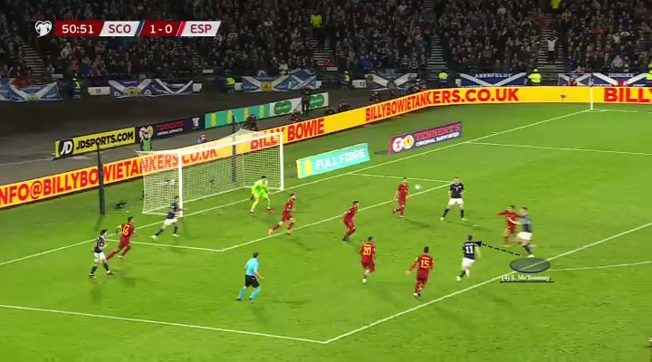 But then channelling his inner Frank Lampard, Scott McTominay has also grown in his understanding of how and when to arrive inside the penalty area. For Scotland, much of their threat comes down the left-side with the double attacking armory of Kieran Tierney and Andy Robertson. As you can see in the image, McTominay’s nowhere to be seen when Tierney delivers the first bite of the apple.