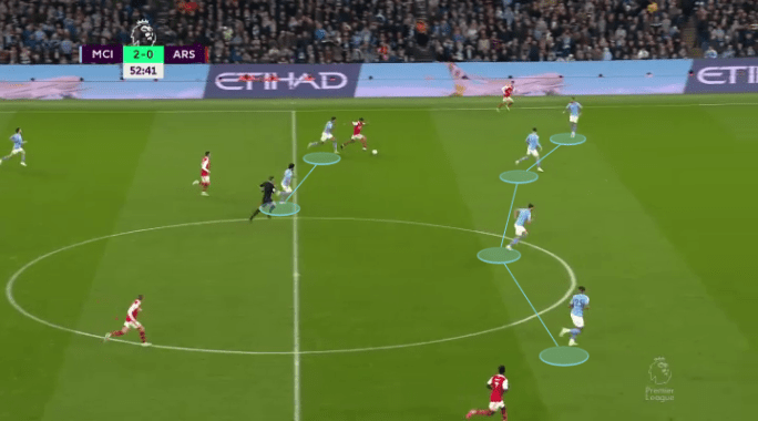 Even at that, you wouldn’t necessarily expect a carbon-copy of the same sort of tactics to spring to life. Not least given the fact that Guardiola’s ideologies this time around are wild, to the say the least. The idea of centre-backs stepping into midfield in build-up to progression phases of possession is peculiar. It forms a nice 3+2 that supports triangulations, rest-defense, and adequate progression through the thirds (often from forcing the opposition to condense the centre and leave more space out wide). But that doesn’t explain why it’s a centre-back making that shift, rather than say a full-back, like Guardiola did in the past.