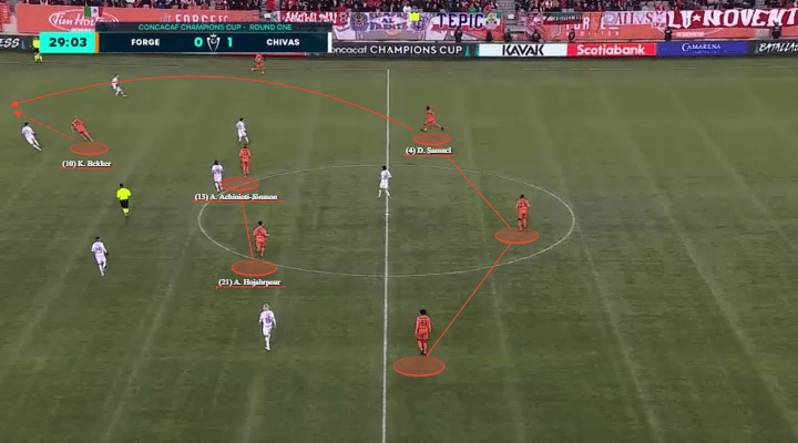 But Forge are stacked with players who can play out from the back, and they don’t necessarily need Achinioti-Jönsson to be a key figurehead in facilitating that process from the deepest place on the pitch. Instead, as Bobby Smyrniotis recognized, you can push him into midfield areas alongside Hojabrpour. In doing so, you can push dangerous creators like Kyle Bekker further forward.