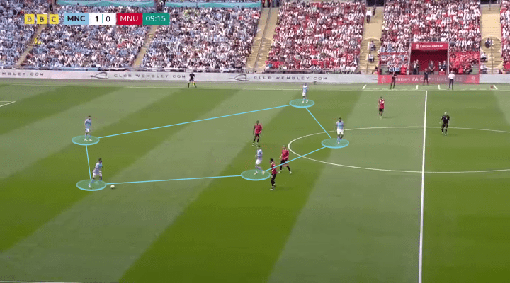 Guardiola can manipulate games like this, opening the spaces that he wants to attack, all the while maintaining a secure 5-man rest defence. Since Bernardo Silva isn’t exactly a defensive player, you don’t want him to be limited to that deeper role. Others can feature in the defensive structures instead, as the talent higher up the pitch wreak havoc.