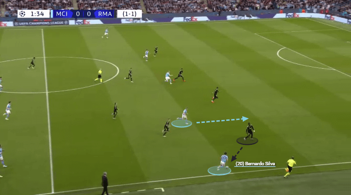 Embed from Getty ImagesIf you want to maximize Bernardo Silva’s individual quality, positioning him centrally unlocks the Portuguesa’s potency in tight spaces, allowing him to impact more of the game in all phases of possession. Yet, for Man City as a whole, having the dribbling delight hugging the right touchline gives the opposite defence a wide threat they do not want receiving the ball. This stretches their back-line and creates more space inside for City’s interior midfielders to operate. So despite all the quality Bernardo offers in the centre of the park in helping City control games, he’s often positioned out on the right.