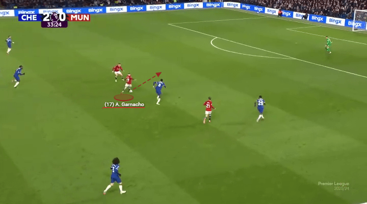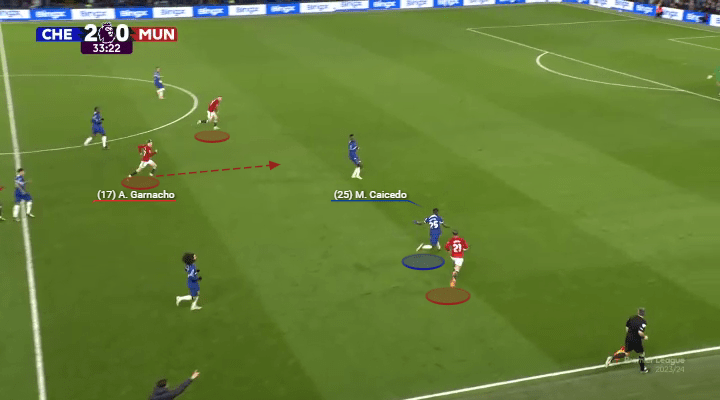Take United’s first goal in their 4-3 loss to Chelsea. Garnacho reads everything about this moment brilliantly. He reads Caicedo’s body positioning with the pass, shaping up to play to Benoît Badiashile. He reads Badiashile’s body too, expecting the pass to be played into the keeper. The United man simultaneously reads the pressure on Caicedo’s back from his teammate Antony, and knows the pass is about to be played. So he immediately springs into action.