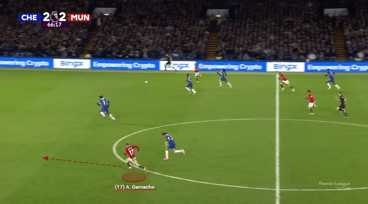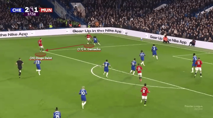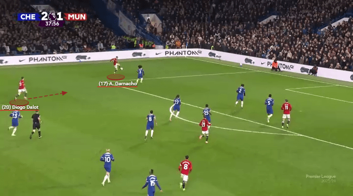 Against Chelsea, it’s the first option that happens, as the two-footed trickster takes a floating pass down from Antony with exceptional control. Dalot’s already prepared to take the next pass and put one into the box.